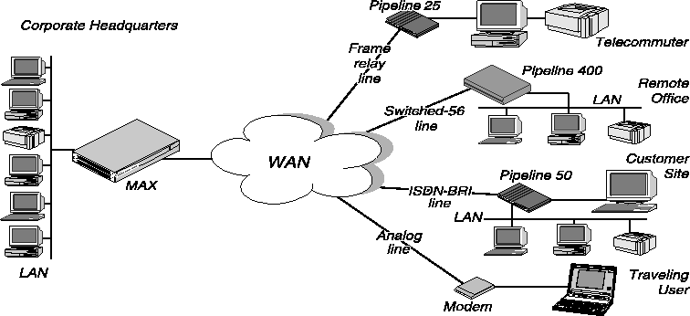 In this example network, a telecommuter in a home office logs into the corporate LAN using a Pipeline 25 and Frame Relay. Users on a remote office LAN access the backbone via a Pipeline 400 with a switched-56 connection. A customer can access selected corporate network resources using a Pipeline 50 with an ISDN BRI connection. A mobile user with an analog modem can dial into the backbone, provided that the MAX has a digital modem card installed.